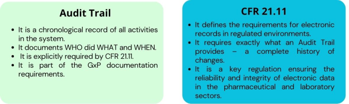 - Audit Trail ensures data integrity and traceability in accordance with the requirements of 21 CFR Part 11 and the principles of good manufacturing practice (GMP).